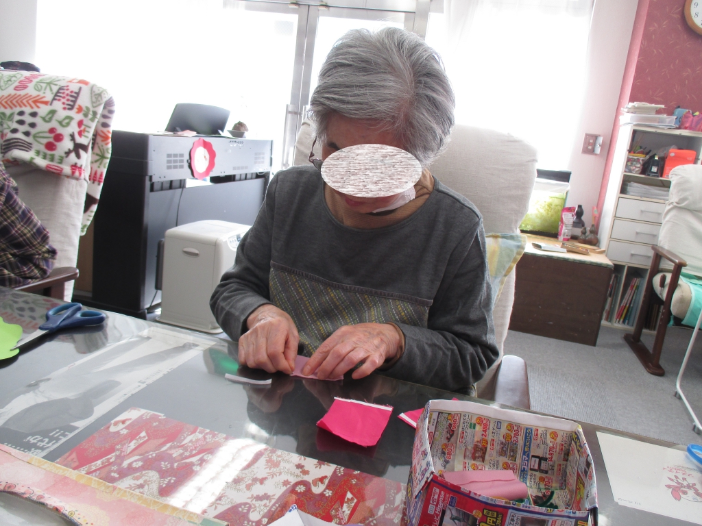 はぎれを使い、針と糸を使わないでも制作できる季節のお花、シクラメンの飾りを作りました。真赤なもの、ピンク、チェック柄、可愛い花柄模様とそれぞれとてもかわいく完成しました。はぎれを袋状にしてひっくり返すところに皆さんより「なるほどなー」との声を頂きました。