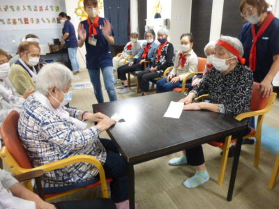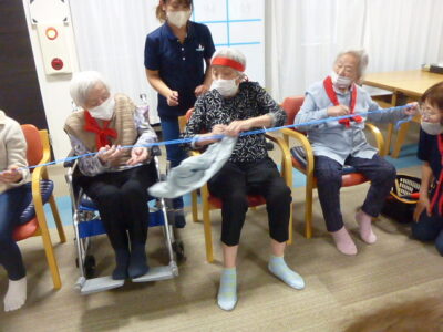 向かい合った二人で紙(トイレットペーパー)を引きあいます。
