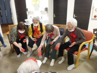 穴に落ちないよう紅白の玉を周囲から投げて乗せるのです。