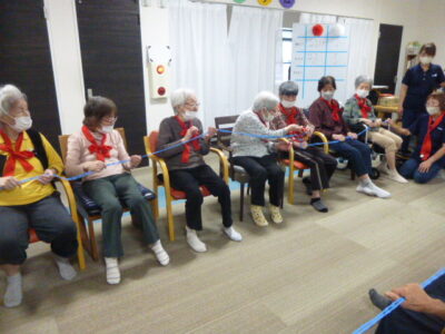 チームごと、端から端まで渡したロープに10個の物を通して送ります。