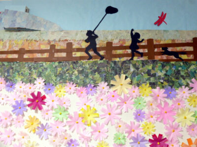 山や丘、手前の緑地は新聞紙のちぎり貼りで柔らかさを出しました。