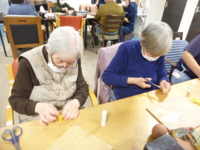 茶色の色画用紙を柔らかくなるまで揉んだあと、小さくちぎります。
